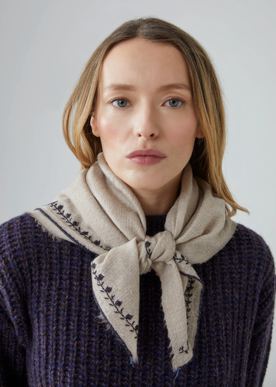 The Ida scarf N°792 seduces with its refined simplicity, embodying the discreet elegance of the Moismont clan. Handwoven in a precious blend of cashmere and wool, it combines softness, warmth, and lightness to delicately accompany every moment. Its 65 x 65 cm square format lends itself to all desires: around the neck, in the hair, or as a bag accessory. Plain and highlighted with a fine contrasting border, it reveals a subtle graphic touch, enriched by the "M" embroidery, Moismont's discreet and refined signature.