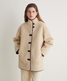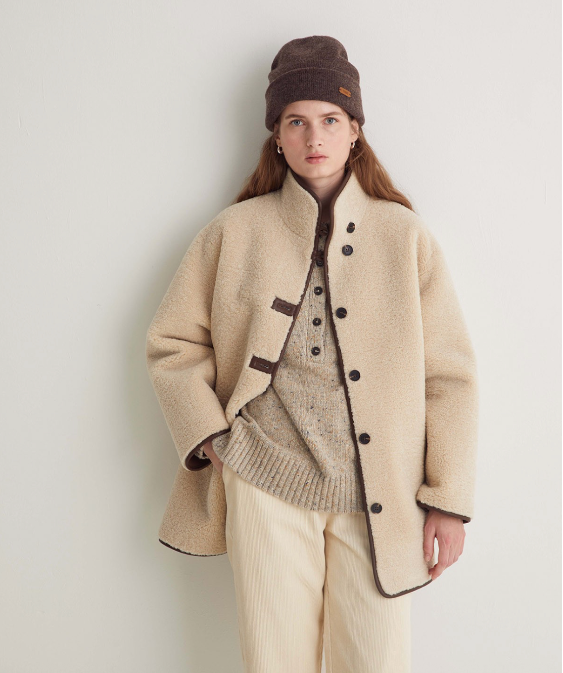 Double-faced faux-shearling coat. Regular fit. High neck. Long sleeves. Long sleeves. Front buttons. 3 side pockets.