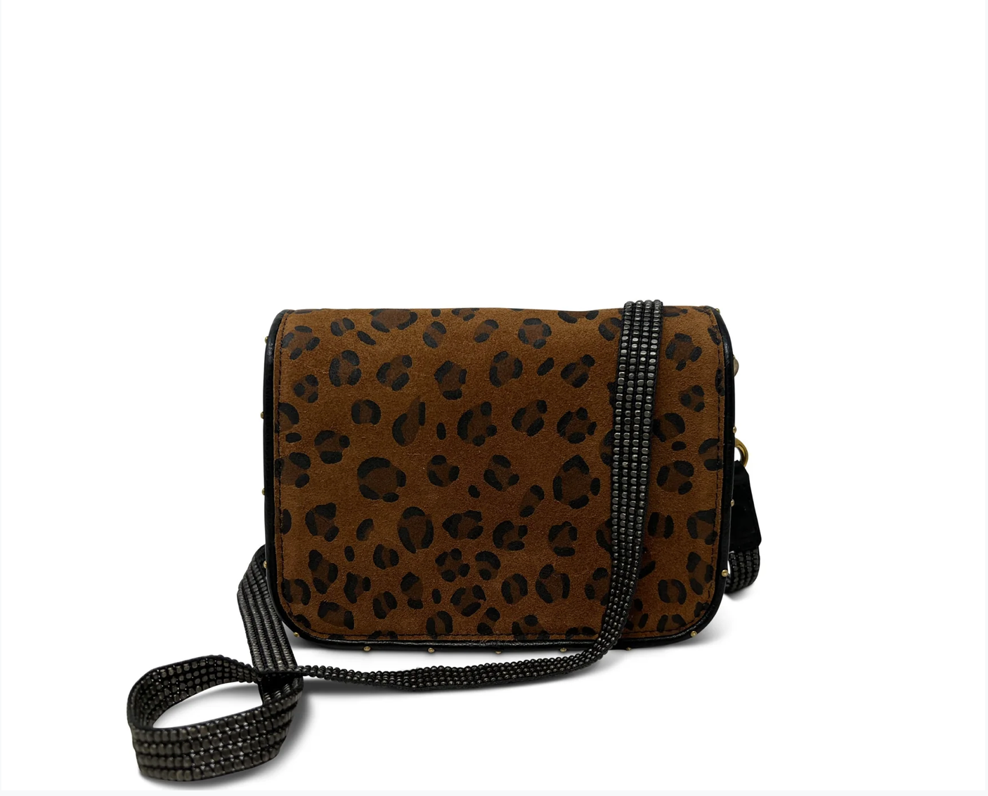 This Mini Mia in the leopard print suede, metallic beaded strap and brass studded trim has every bit the spirit of a high-profile, socialite diva. Goes to the disco; goes to the cocktail party; goes to an art vernissage, and then on to Sotheby's for an auction of rare violins. This bag just goes and goes and never runs out of style and steam. Unfasten the standout beaded strap and you have a beautiful clutch for daytime, nighttime, anytime, anyplace, even placed on the dinner table of that impossible-to-get-into hotspot where you've just ordered wok-tossed lobster tails. With inside, outside, under the flap pockets to stash your phone and valuables, you've got the right mix of safety, sophistication and flash wherever you go.