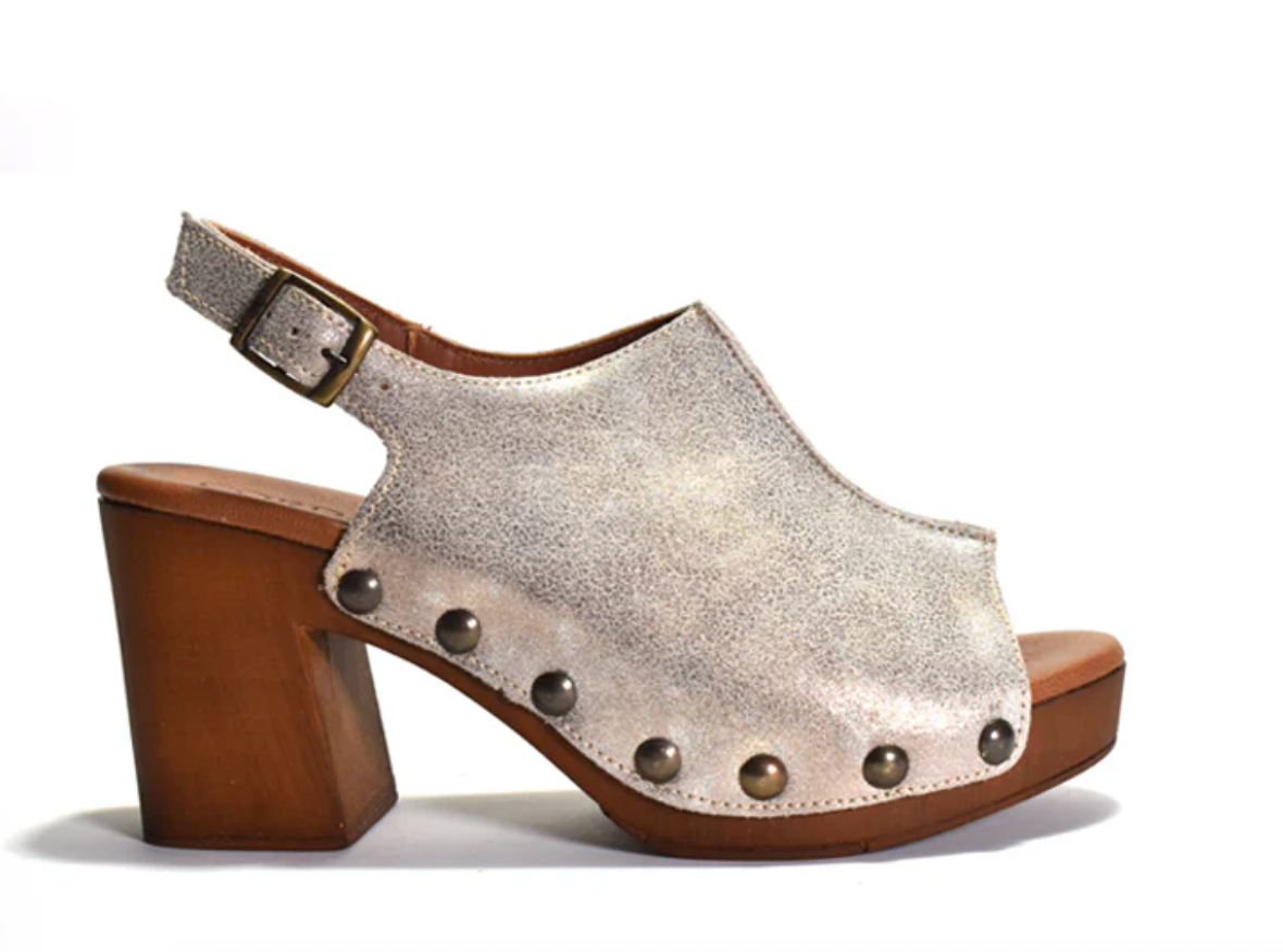 Step out boldly with the Winnie Shimmer Platform Heel, featuring a peep-toe slingback accented by edgy stud details on a wood-inspired platform. The adjustable buckle ensures a perfect fit, while the lightly padded leather footbed and lining offer comfort with every stride. Finished with a durable rubber sole and crafted in Italy, this daring heel stands 3 1/4 inches tall with a 1-inch platform to elevate your look and confidence.