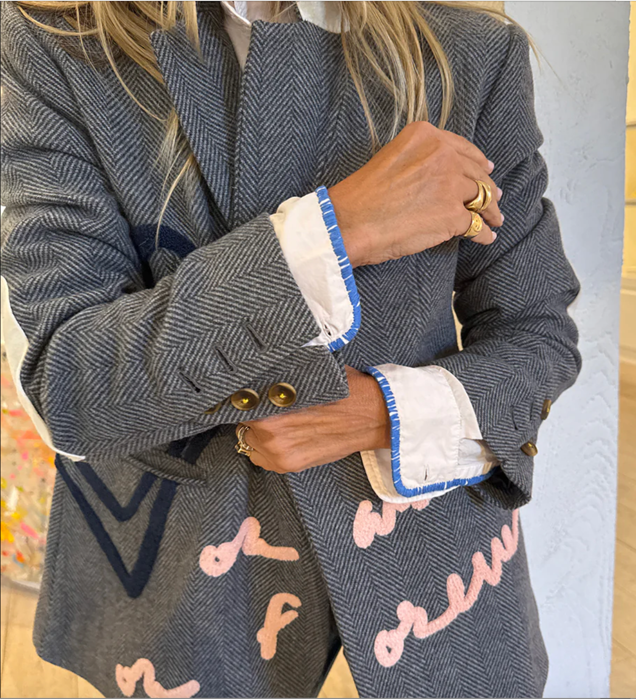 The Workday On and On Blazer has a slightly oversized fit and is altered with embroidered KR messaging and icons. This is a limited edition blazer.