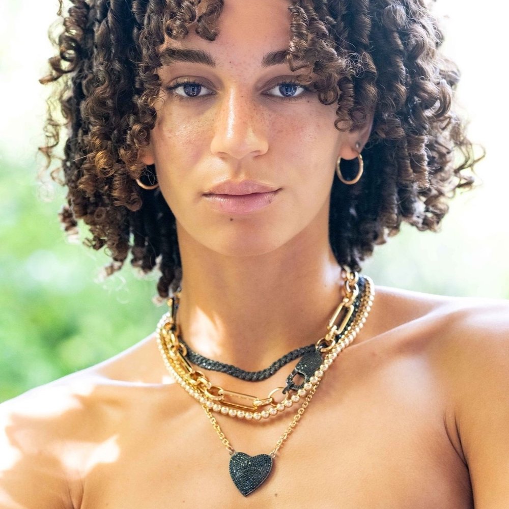 Jocelyn comes from the heart. Pavé spinel heart on a gold vermeil chain, 16 inches long with an option for a 2 inch extender. Looks great on it's own or layered. We love this with a casual t-shirt or going out to a nice event. We love Jocelyn!