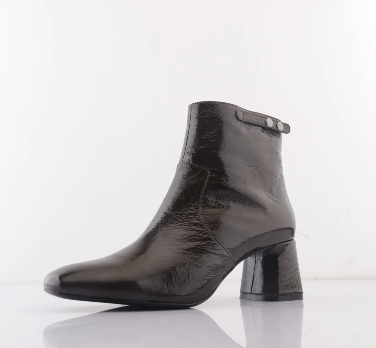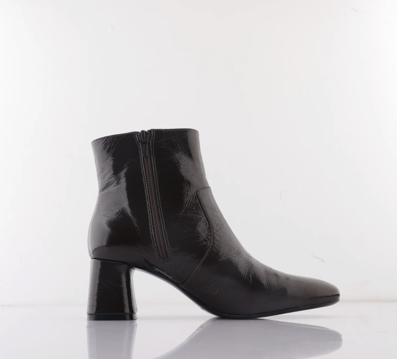This boot is your new everyday ankle boot obsession. This beauty features luxurious chocolate brown leather with a crinkle glossy finish that gleams as you move. Slip into the buttery-soft pale pink kid leather lining and feel the difference—paired with a plush memory foam insole and a graceful 6 cm heel, you get that perfect lift without sacrificing comfort or stride. Whether you're running errands or making an entrance, the Kimmy delivers style and wearability in one irresistible package.