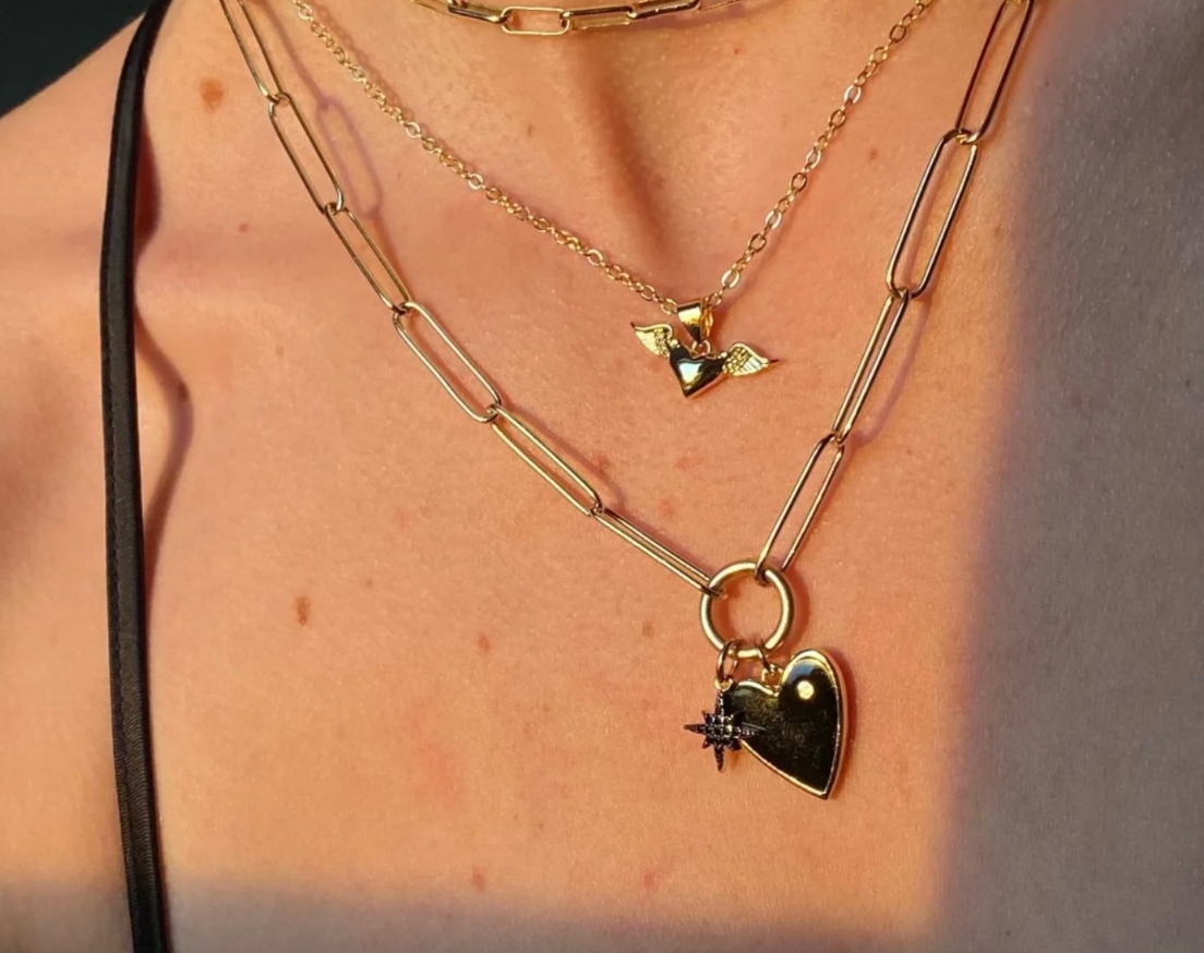 A delicate gold-filled heart adorned with black enamel meets a shimmering crystal north star. Perfect for those who find beauty in the night sky, this piece combines celestial charm with timeless elegance.