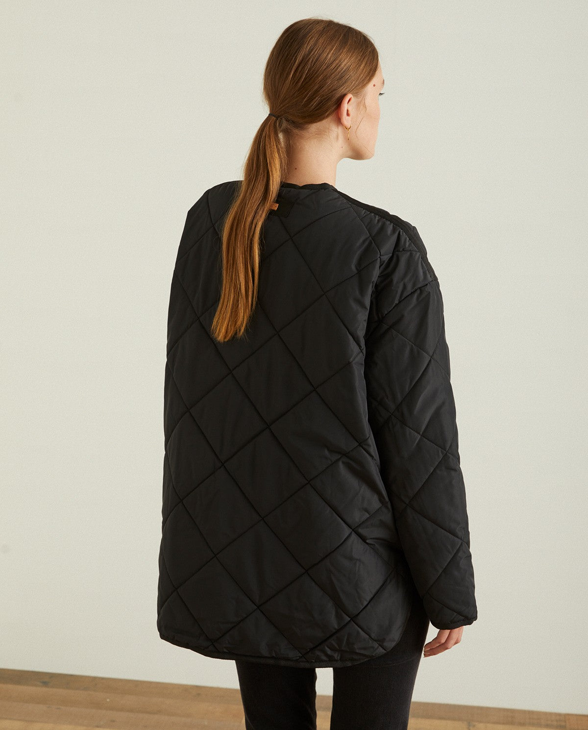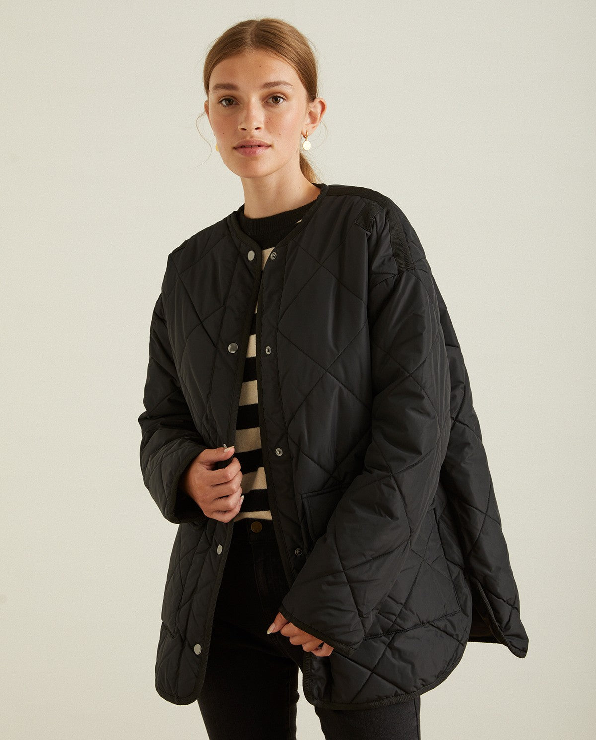 Stay warm and stylish with this luxurious Black Water Resistant Quilted Coat. Crafted in a blend of recycled polyester and polyester, this coat features a water-repellent quilted construction, two front pockets, and a round neckline.