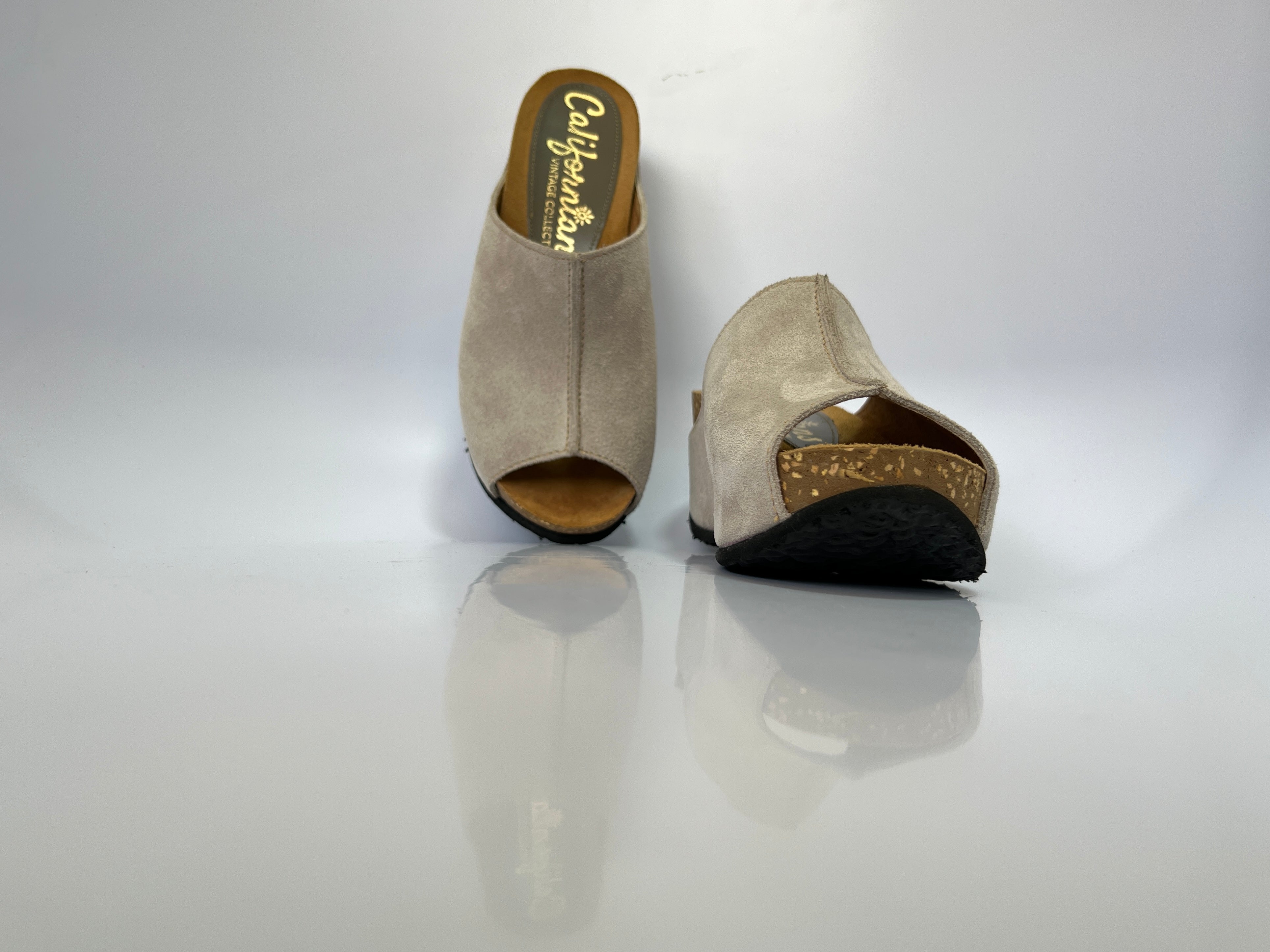 The 'Cecilia' is a wrap-around peep-toe mule wedge handcrafted with a suede upper.
