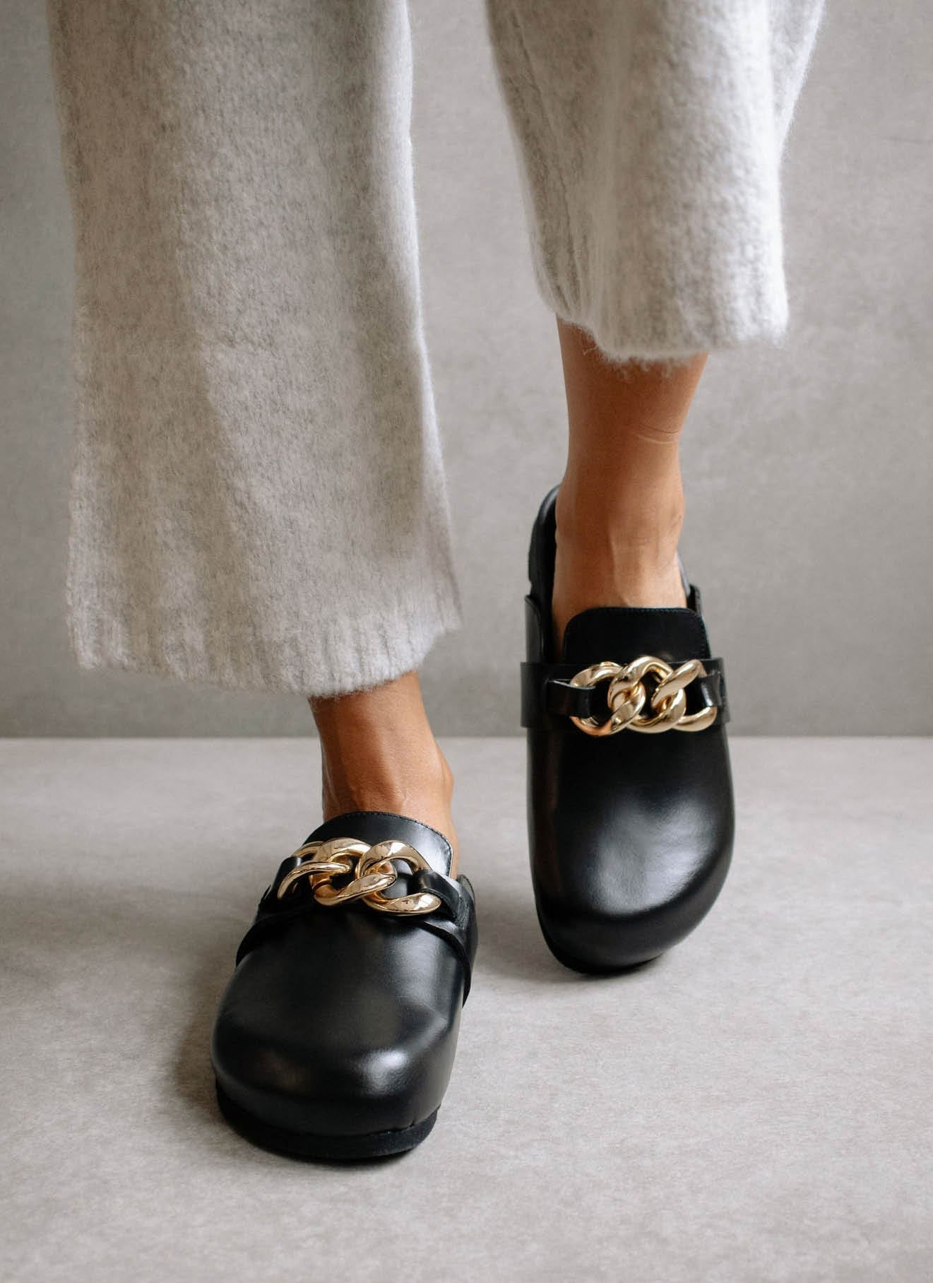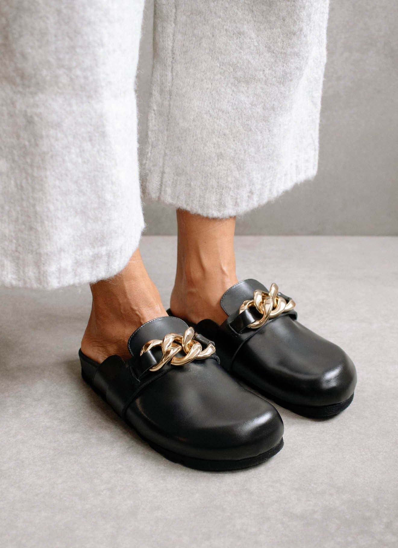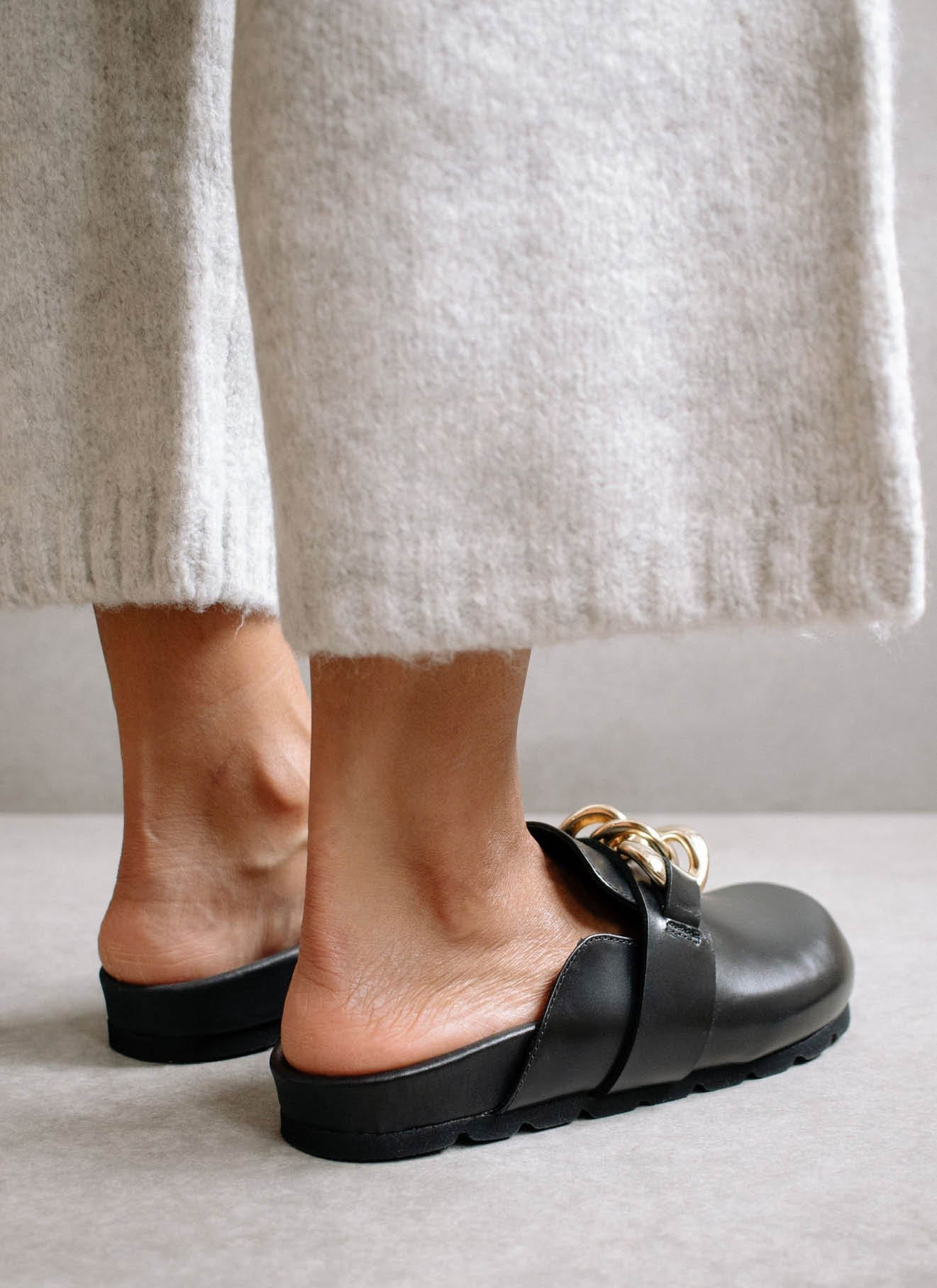 Wide, round-toed clog with an open back and a comfortable feel. Embellished with a maxi link chain on the front.