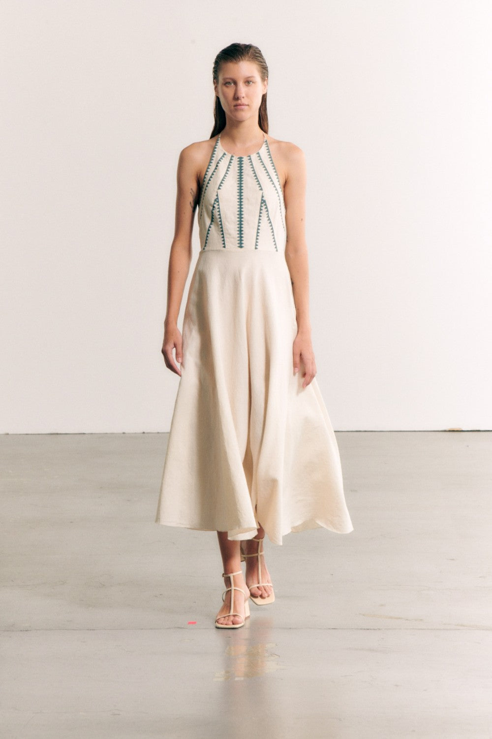 Crafted from luxurious linen, this dress features intricate teal stitching, adding a touch of elegance to its halter style. Perfect for for travel as it looks perfect with sneakers or can be dressed up with heels and looks beautiful for a fancy event!