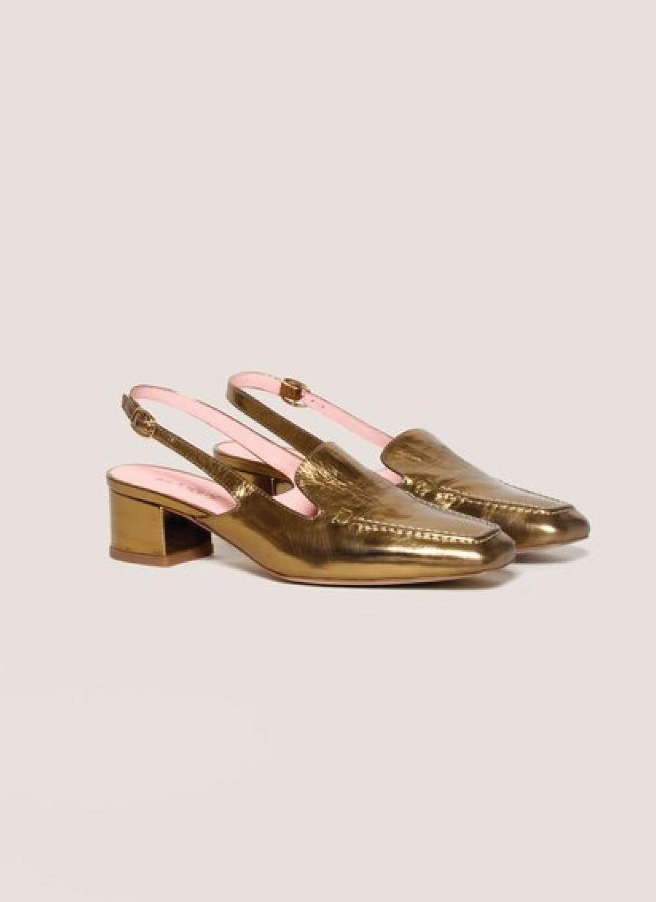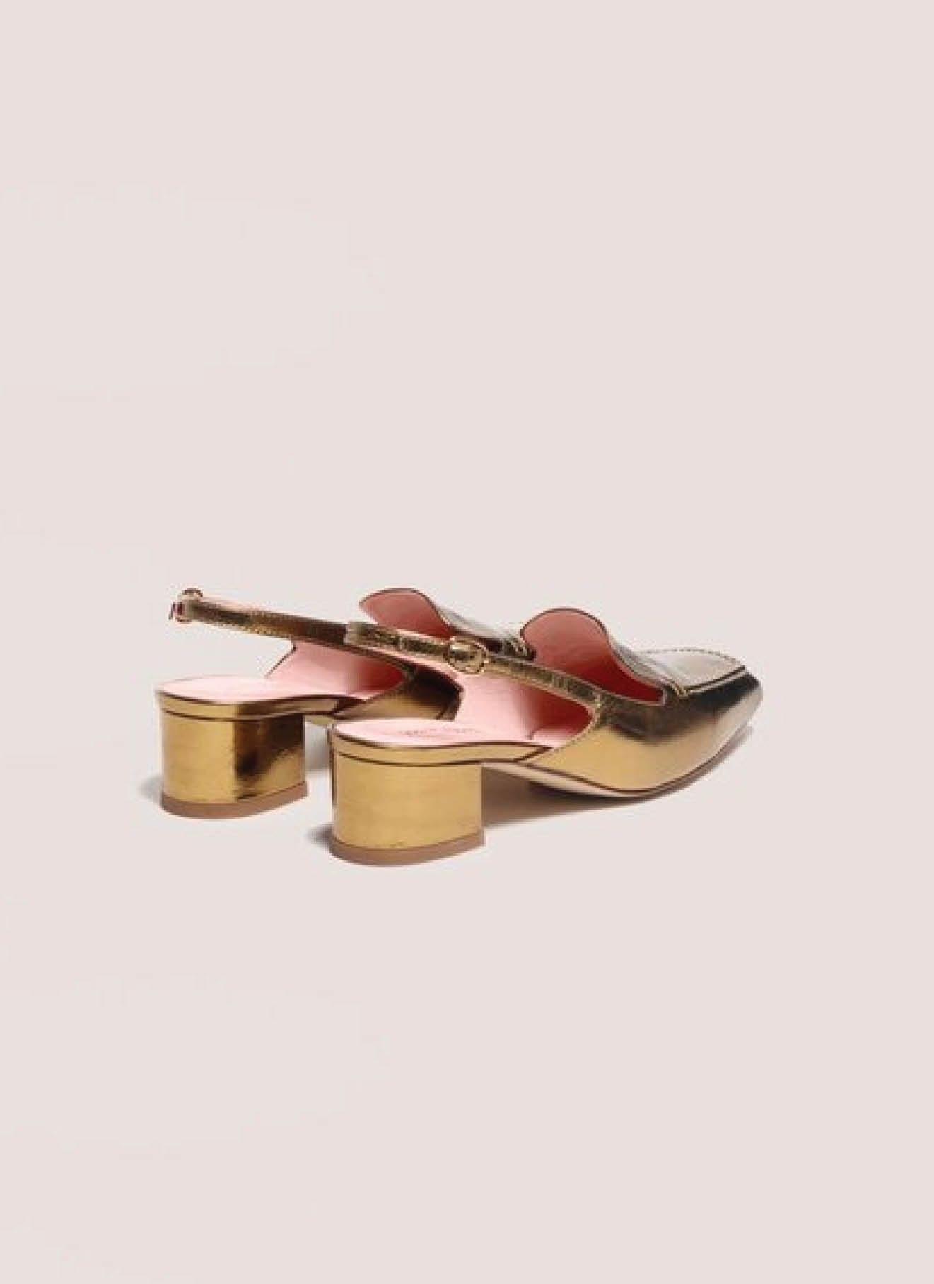 Metallic gold leather exterior. Pale pink kid leather insole and interior. Adjustable strap. Signature square toe.
