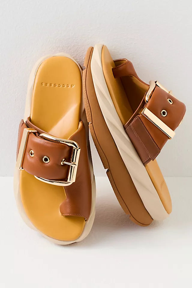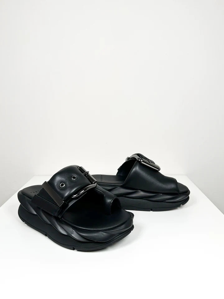 Puffed to perfection, these edgy sandals from 4ccccees are featured in a slide style with a puffy leather buckle strap, major platform sole, and leather toe loop for a totally unique and unbelievable comfortable shoe. This leather might just be the softest you've ever felt, like EVER!!!