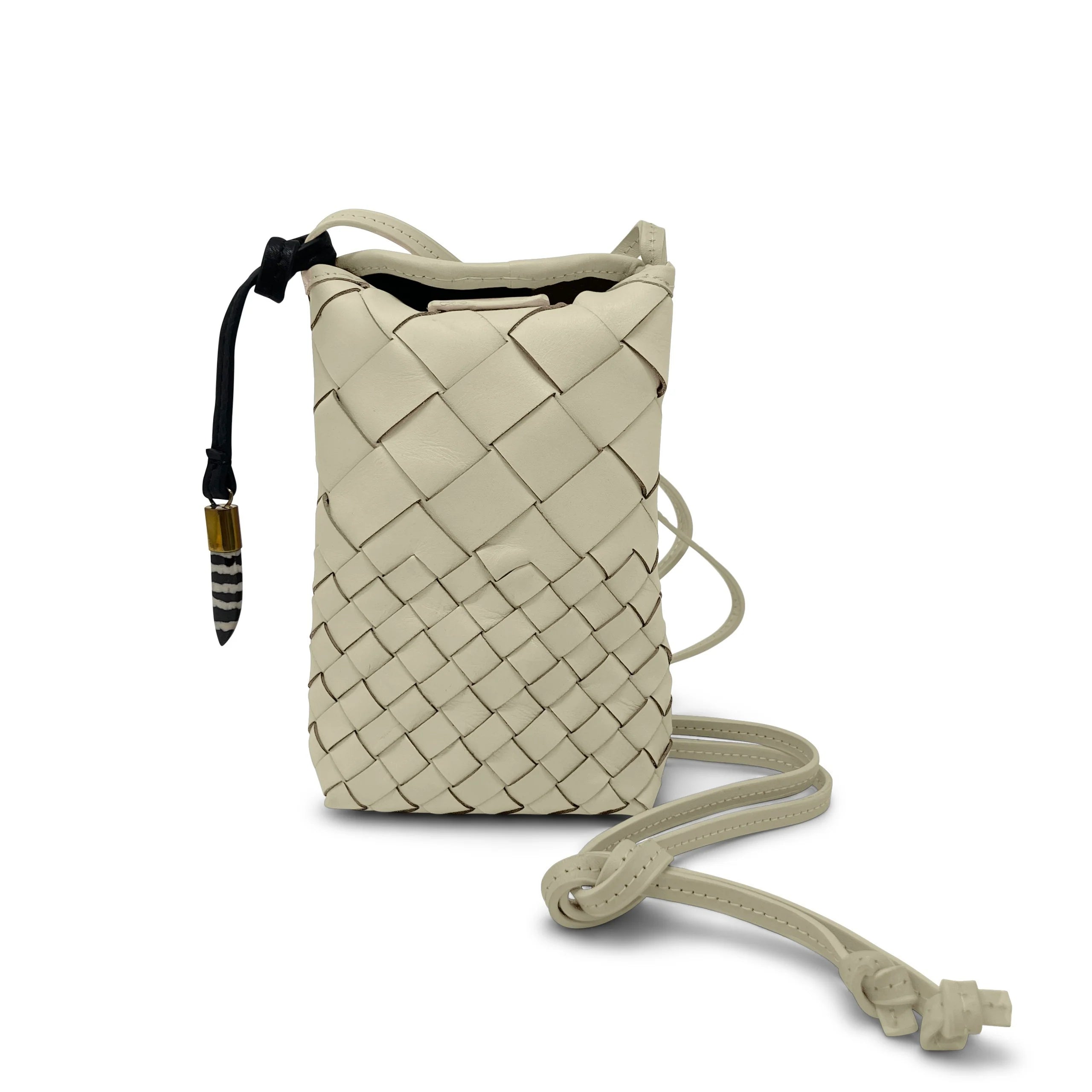 Once you lay eyes on this beauty, it's impossible to forget. The Mini Phone Sling Crossbody in sand woven leather, with its sleek black leather card insert, will capture your imagination and won't let go. This eye-catching piece is designed to become an essential part of your wardrobe, effortlessly blending into your daily adventures.