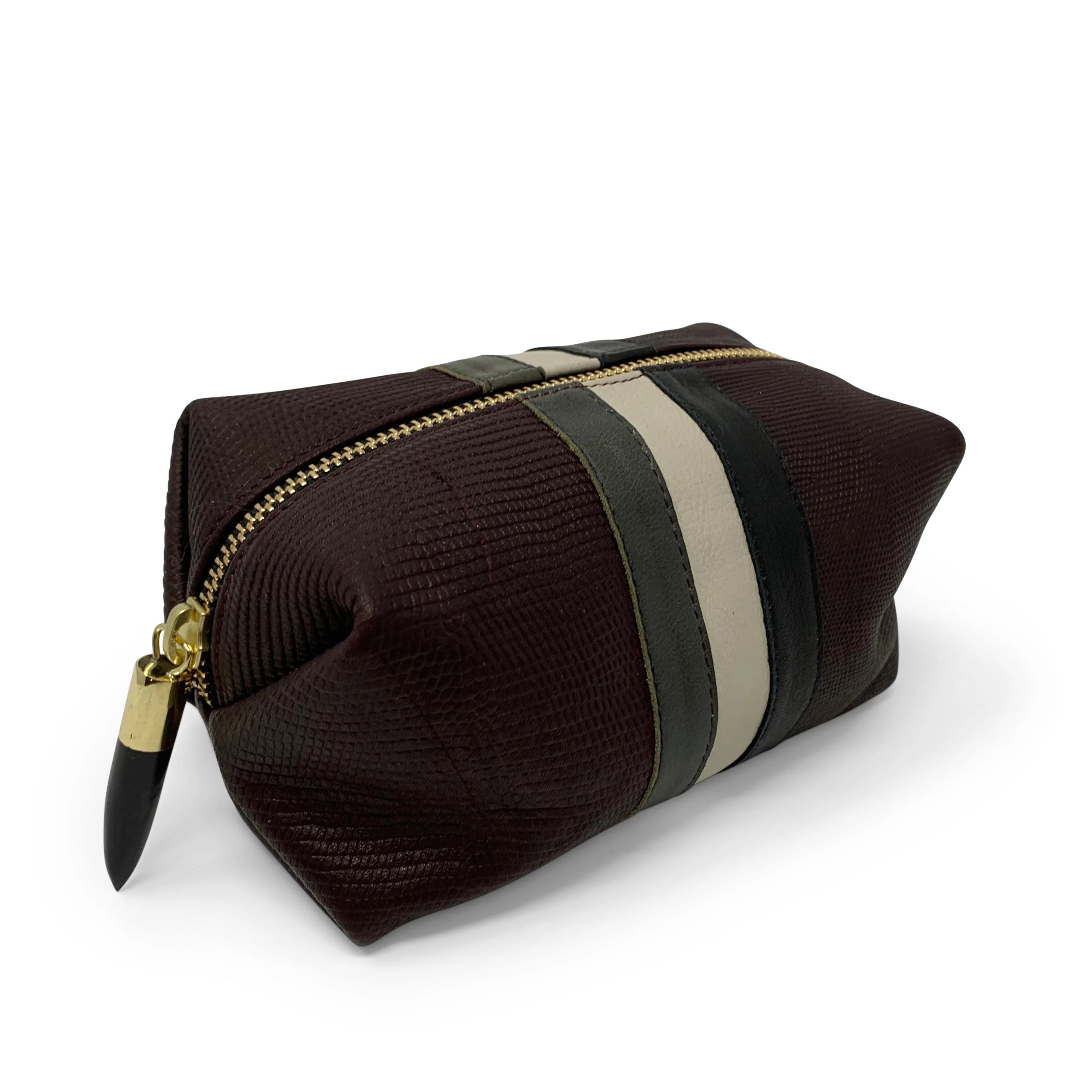 Whether traveling or keeping everything at home in order, the cosmetic case can be packed to the brim of all beauty necessities. Throw inside a larger bag or suitcase to keep everything together on the go! Perfectly small and compact. Printed cowhide leather, solid brass hardware, and a cotton twill lining is trimmed with our signature Kenyan horn toggle zipper pull.