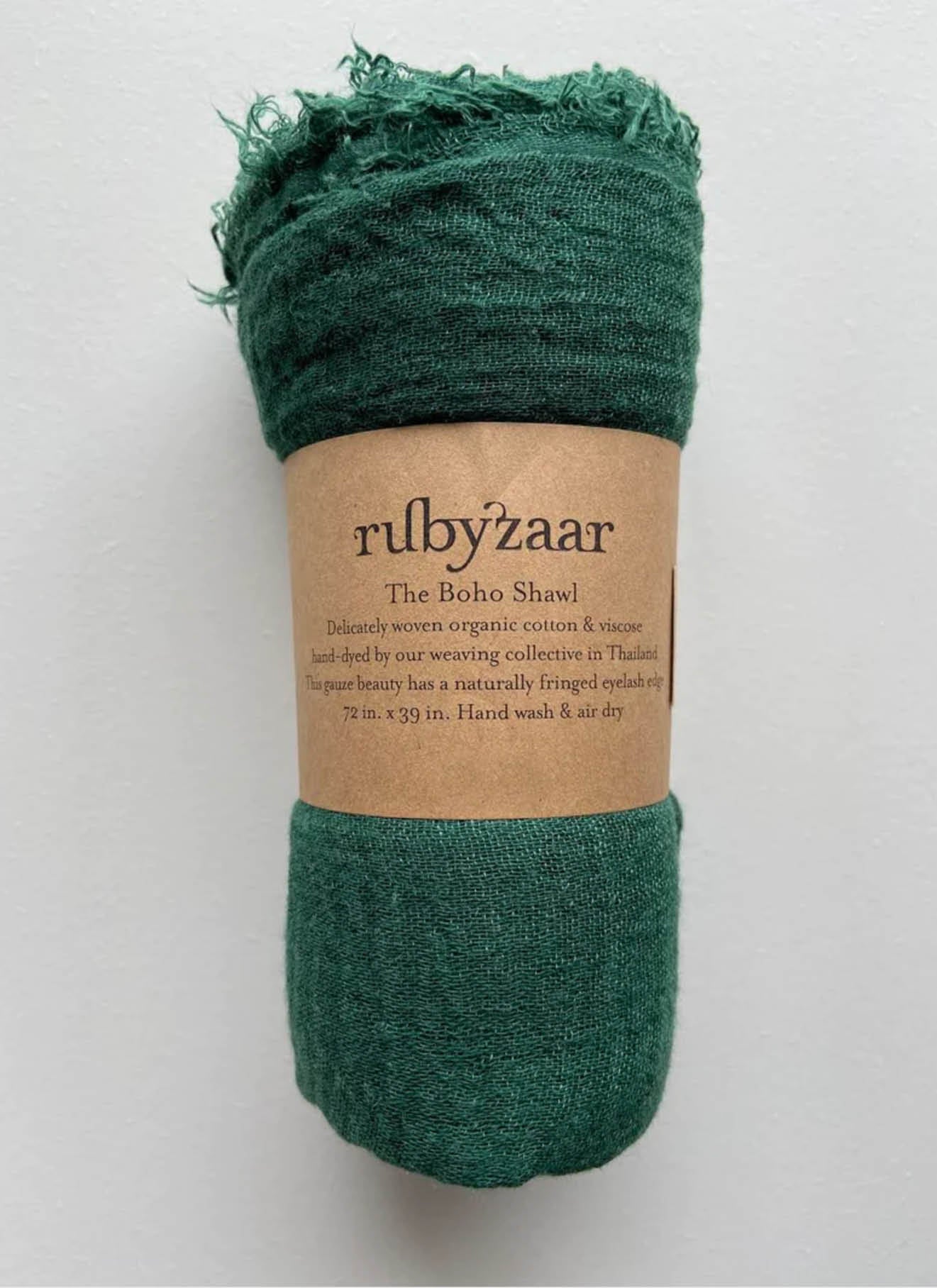 Delicately woven cotton & viscose shawl. Hand dyed by our weaving collective in Thailand. This gauze beauty has a naturally fringed eyelash edge. 72” x 39” Our best selling bohemian style scarf is the perfect accessory for any occasion. Buttery soft and fabulous. 50% cotton, 50% viscose Hand or machine wash gentle cycle