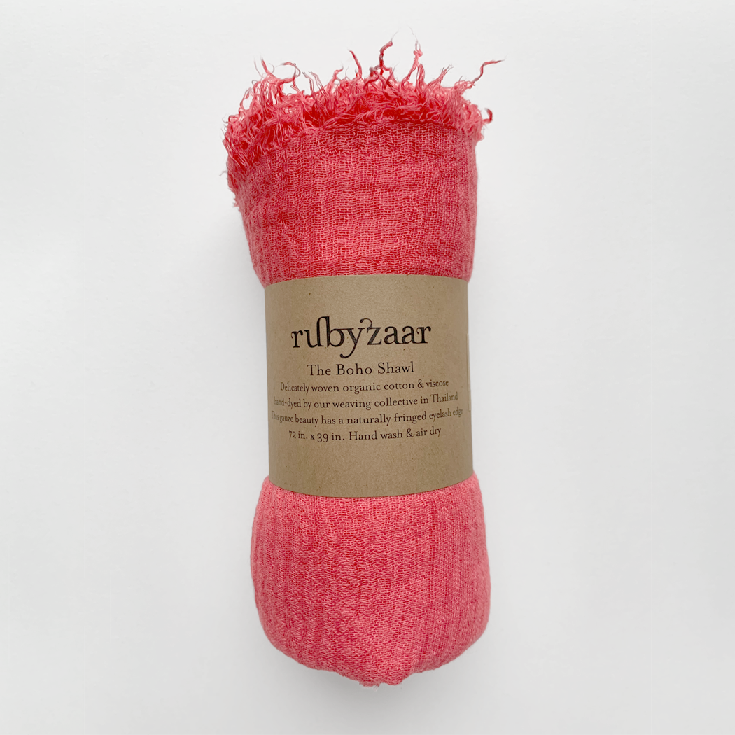 Delicately woven cotton & viscose shawl. Hand dyed by our weaving collective in Thailand. This gauze beauty has a naturally fringed eyelash edge. 72” x 39”