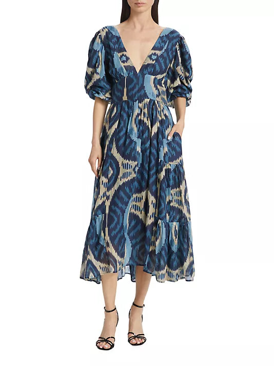 The Elise midi-dress from Love the Label features a geometric print, puff sleeves, and a plunge V-neck.