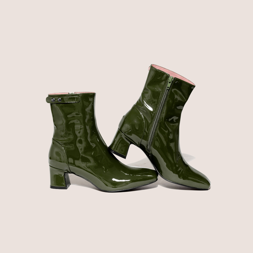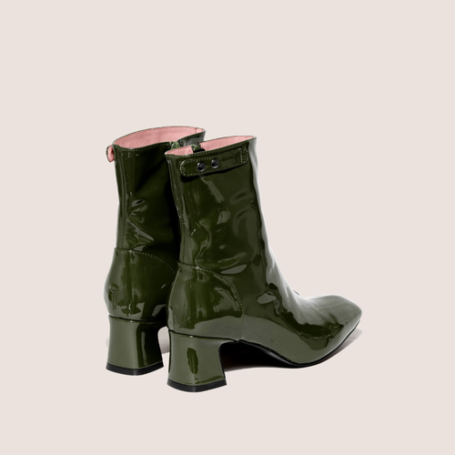 Glossy leather exterior. Pale pink kid leather insole and interior. Signature square toe. Side zipper and outside double snaps. Comfort-designed memory foam insole at the ball of the foot, arch, and heel. Imported materials. Heel height 5 cm / 2 inches.